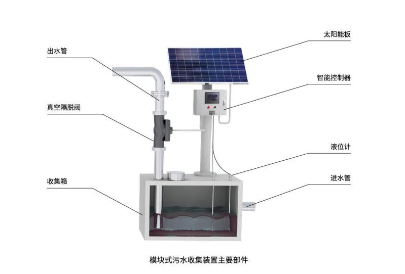 模塊式污水收集裝置是整套負(fù)壓排水系統(tǒng)的核心控制元件,也是負(fù)壓排水系統(tǒng)得以實(shí)現(xiàn)的關(guān)鍵設(shè)備。模塊式污水收集裝置根據(jù)現(xiàn)場情況靈活安裝,設(shè)備采用中部進(jìn)水,上部出水的設(shè)計(jì)。進(jìn)水口有四個(gè)方向,可根據(jù)現(xiàn)場情況靈活調(diào)整安裝方式。此設(shè)備主要功能是控制收集的污水有序進(jìn)入負(fù)壓管網(wǎng),無空氣進(jìn)入。